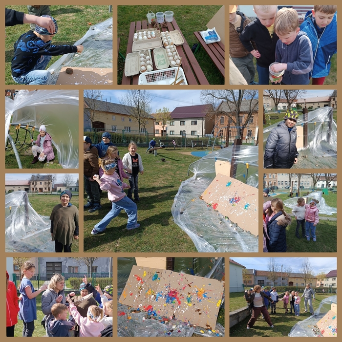 My jsme použili vaječné skořápky naplněné barvami, které jsme s chutí vrhali ne na plátno, ale na velký kus kartonu. Výsledkem je obrázek vskutku abstraktní, posuďte sami.