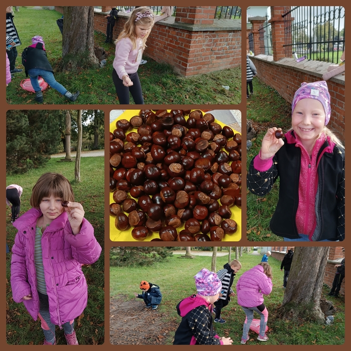 V pondělí jsme se vypravili sbírat kaštany. Našli jsme pěknou hromádku, kterou ještě rozšířili z vlastních zásob dva ochotní dárci, děkujeme. Příští týden budeme z kaštanů společně vyrábět, zbytek odneseme před zimou jako krmivo pro zvířátka.