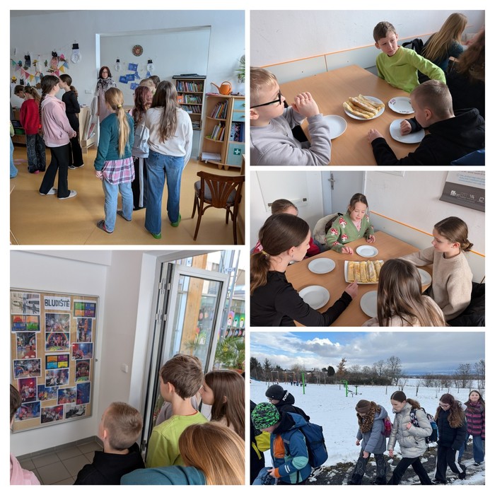 Velmi milým zakončením návštěvy bylo občerstvení, které pro nás připravily deváťačky – jejich výborné palačinky potěšily úplně všechny. Zároveň to byla hezká ukázka toho, jak mohou starší žáci převzít zodpovědnost a podílet se na reprezentaci své školy.