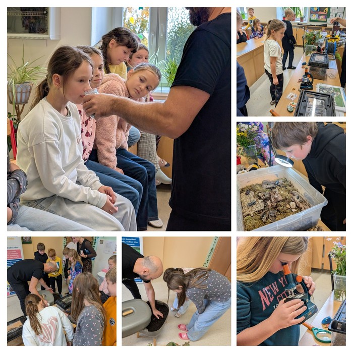 Celá škola se v úterý 14. října zapojila do přírodovědného programu, který proměnil počítačovou třídu v živou učebnu. Program probíhal hravou formou a zapojil téměř všechny smysly. Děti poznávaly bylinky podle vůně, zkoumaly brouky a dozvěděly se, proč jsou žížaly tak důležité pro půdu. Odvážnější žáci si nechali žížaly lézt po ruce.