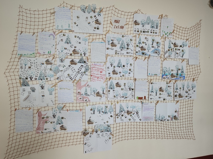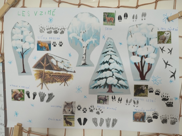 Každý žák dostal za úkol zpracovat výkres, který zachycuje život v zimním lese. Žáci pracovali se šablonami zvířat, stromů a stop, které pak skládali do vlastních obrazů zimní krajiny.